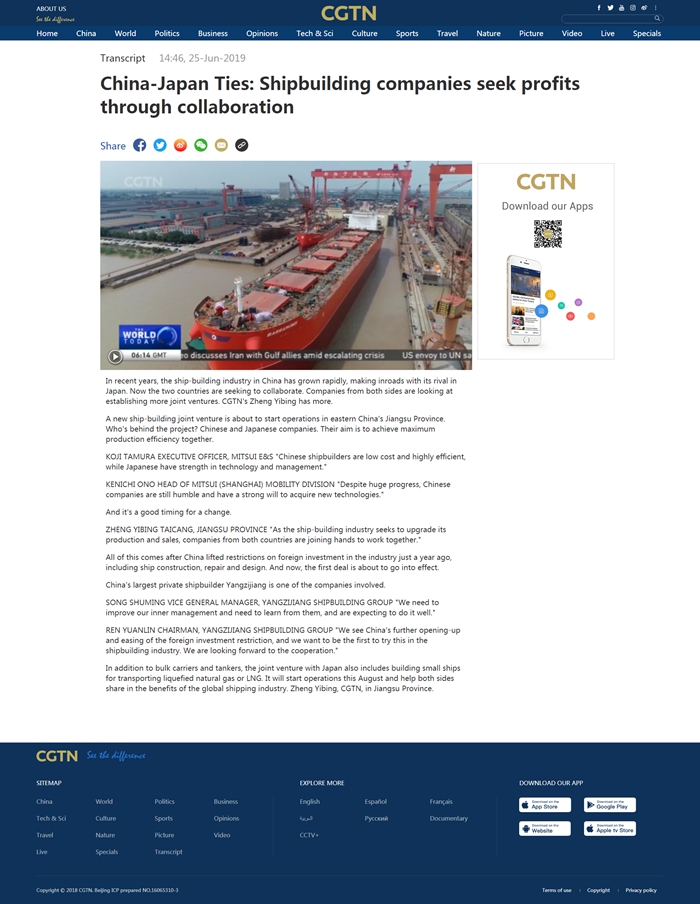 二十國集團(G20)領(lǐng)導(dǎo)人峰會將于本月28日至29日在日本大阪舉行,峰會發(fā)布八大主題,經(jīng)貿(mào)仍唱主角。當(dāng)前全球經(jīng)濟增長乏力,根據(jù)世界貿(mào)易組織、聯(lián)合國等多邊組織發(fā)布的相關(guān)報告,全球經(jīng)濟在貿(mào)易、投資等方面都缺乏動力。在此背景下,CGTN(中國國際電視臺)記者鄭亦冰走進揚子江船業(yè),探尋中日造船企業(yè)通過合作造船,實現(xiàn)共贏的相關(guān)進展。